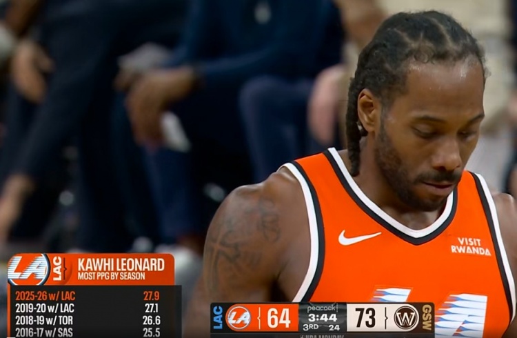 快船客场挑战勇士,转播方给出伦纳德生涯得分最高的几个赛季统计: